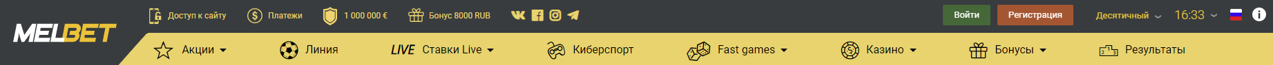Шапка сайта выполнена в фирменных черных и желтых тонах, основное поле — светлое, интуитивное для любого пользователя. Напротив логотипа БК Melbet — доступ к основным разделам: